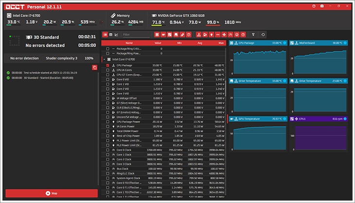 다음은 OCCT CPU 테스트와 3D 스탠다드 테스트로 CPU와 그래픽카드를