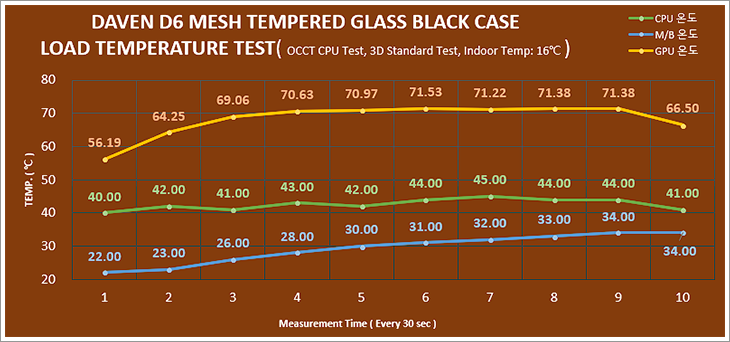 실내온도는 16도였었고 온도는 각 부품의 센서에 따른 값으로 케이스 내부 쿨링 성능으로 참고만 하시기 바랍니다.