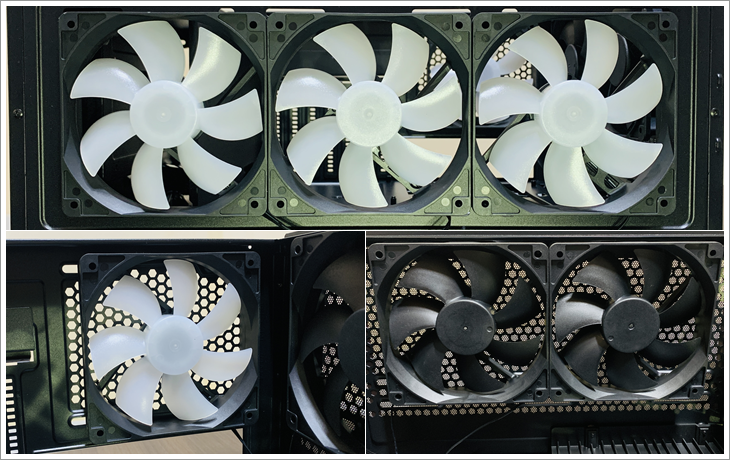 3색 고정 RGB 120mm 팬 전면 3개, 후면 1개와 일반 저소음 120mm 팬 2개입니다.