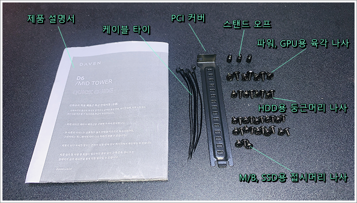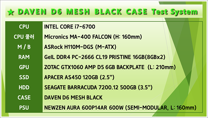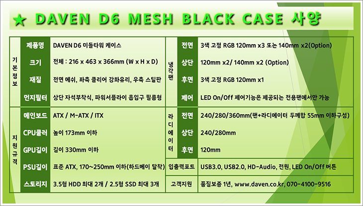 DAVEN D6 MESH 강화유리 블랙 케이스에 장착해 사용할 부품의 사양은 위와 같습니다.