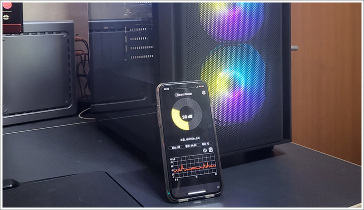 DAVEN D6 MESH 강화유리 블랙 케이스를 사용한 시스템을 작동시켰을 때 팬 소음을 측정해 정리해 보았습니다.