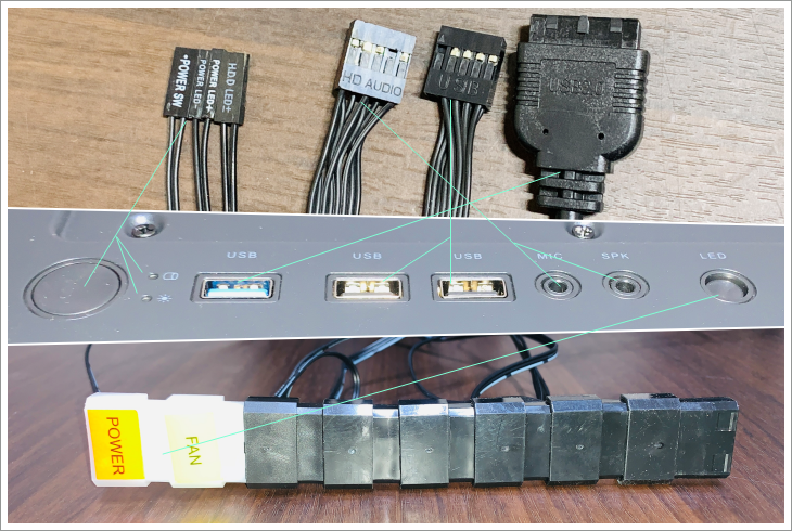 상단 입출력 포트와 단자를 정리해 보았습니다. POWER라고 적혀 있는 뭉치는 6개의 팬 전원선으로