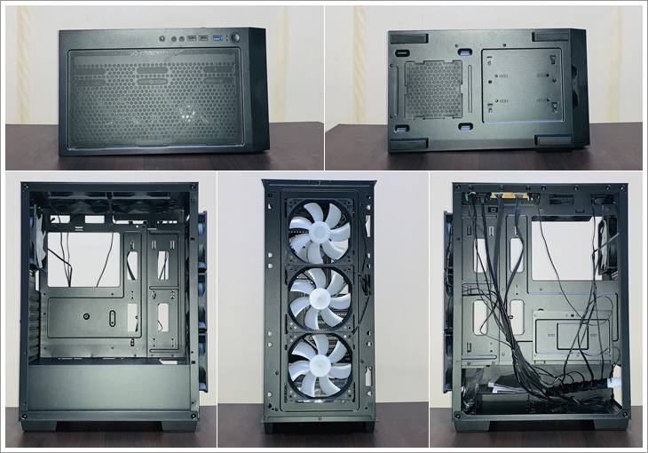 전면 금속 패널은 손을 아래로 넣어 쉽게 탈착이 가능하고 내부에는 3개의 3색 고정RGB 쿨링팬 3개가 있습니다.